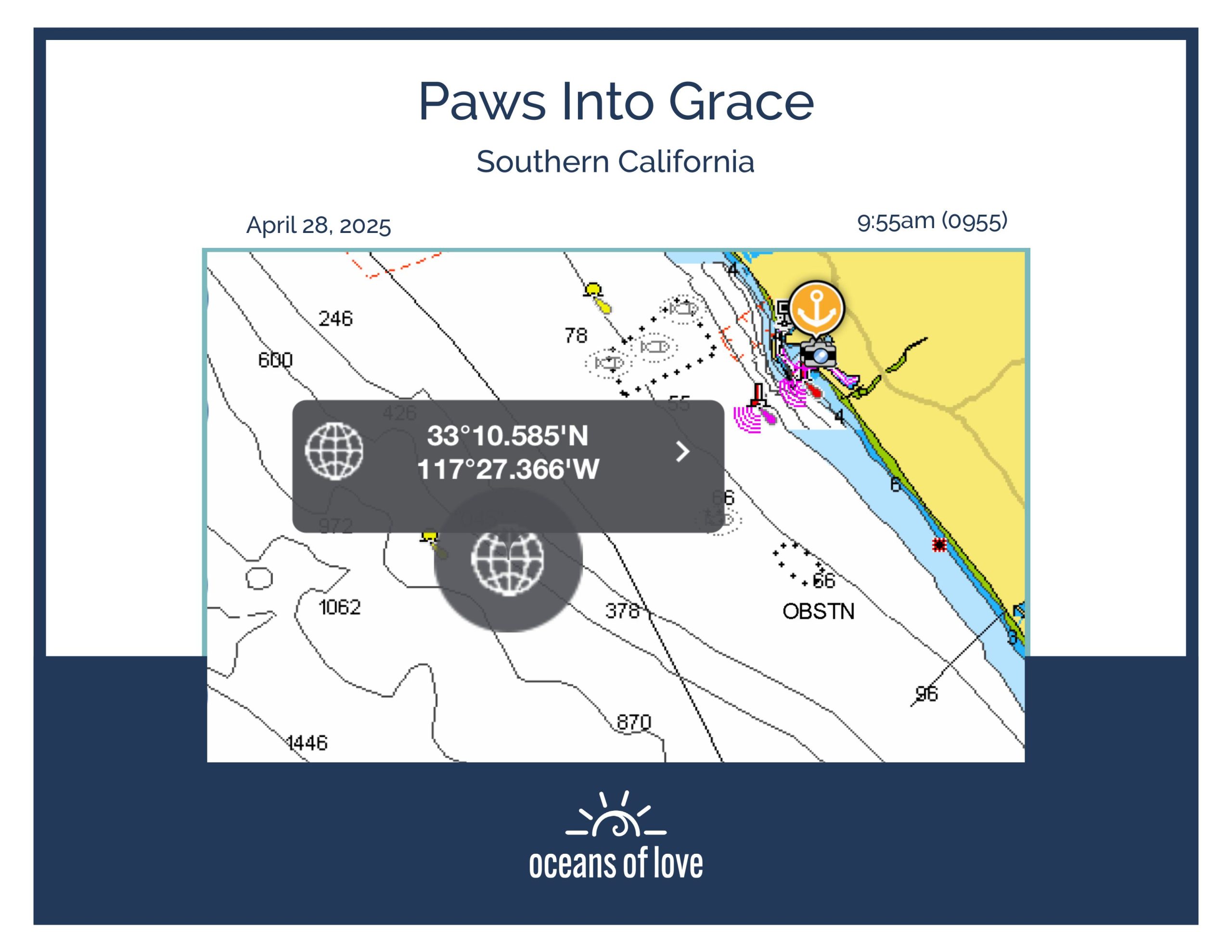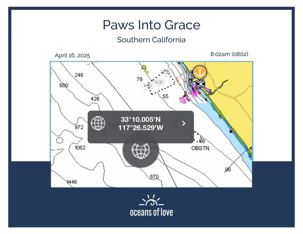 Latitude: 33° 10.005’ North, Longitude: 117° 26.529’ West, on the 16th day of April 2025, 8:02 am on motor vessel Aperitivo through Oceans of Love.