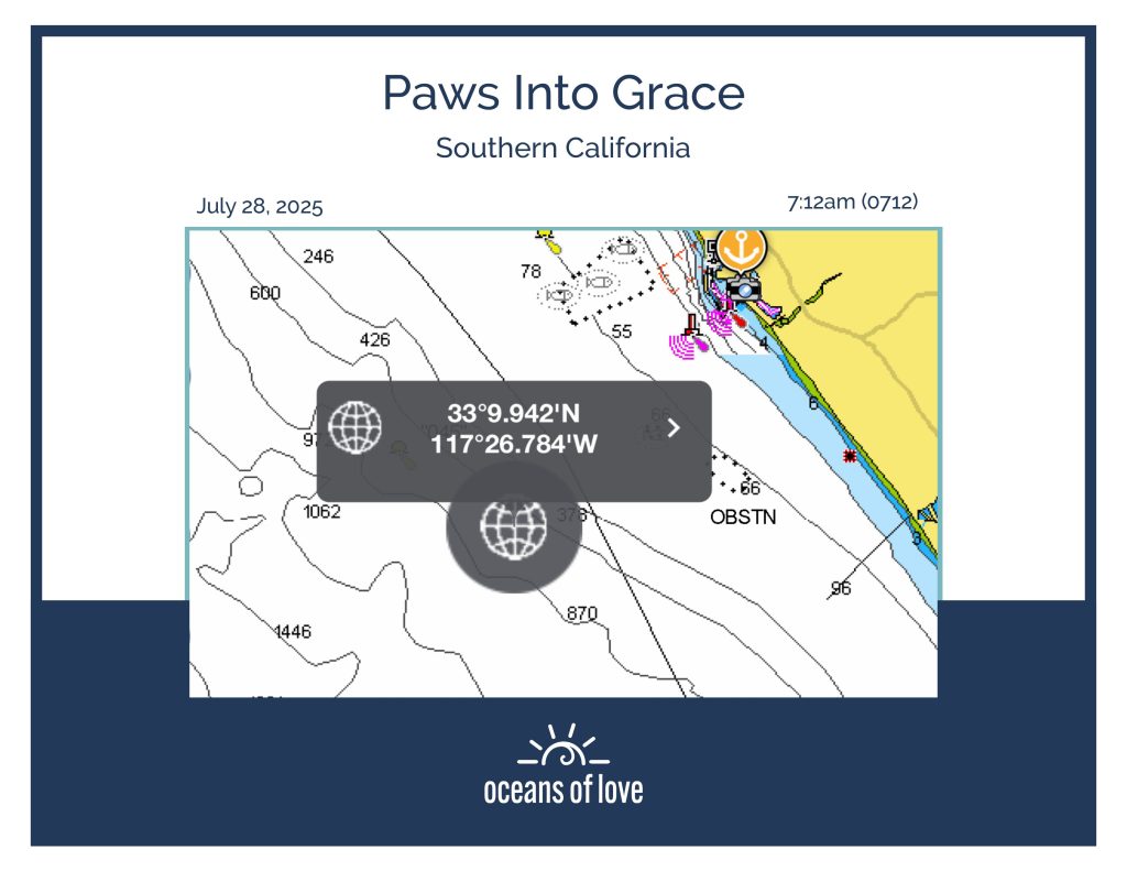 Latitude: 33° 09.942’ North, Longitude: 117° 26.784’ West, on the 28th day of July 2025, 7:12 am on motor vessel Aperitivo through Oceans of Love.