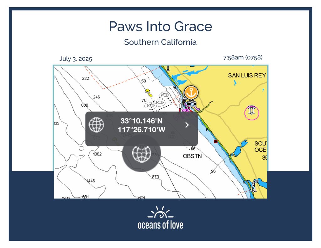 Latitude: 33° 10.146’ North, Longitude: 117° 26.710’ West, on the 3rd day of July 2025, 7:58 am on motor vessel Aperitivo through Oceans of Love.