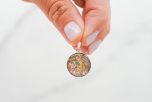 This sterling silver necklace can be customized has a pinch of your pet’s ashes mixed with a color of your choice. Available in Solid colors, Opal colors or Sparkle colors.