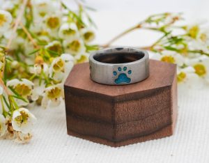 This titanium ring is available in sizes 4-15. This band is lightweight and durable. Paw prints will be swirled with your pet’s ashes and a color of your choice: Solid colors, Opal colors or Sparkle colors.