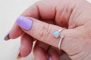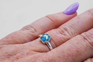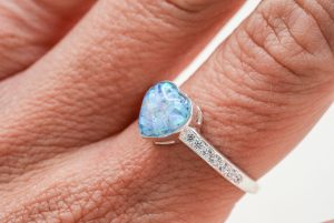 This sterling silver ring is available in sizes 4-10. Your pet’s ashes will be swirled with a color of your choice: Solid colors, Opal colors or Sparkle colors.