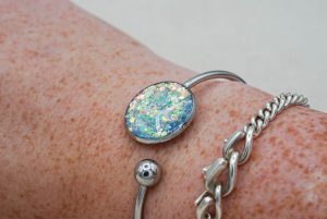 This elegant and flexible stainless steel bracelet features a sleek, modern design with a delicate resin inlay that securely encases a pinch of your pet’s remains and color or design of your choice. Available in the following color options: Ocean Tides design, Whisker Bezel design, Solid/Multi colors, Opal colors or Sparkle colors.